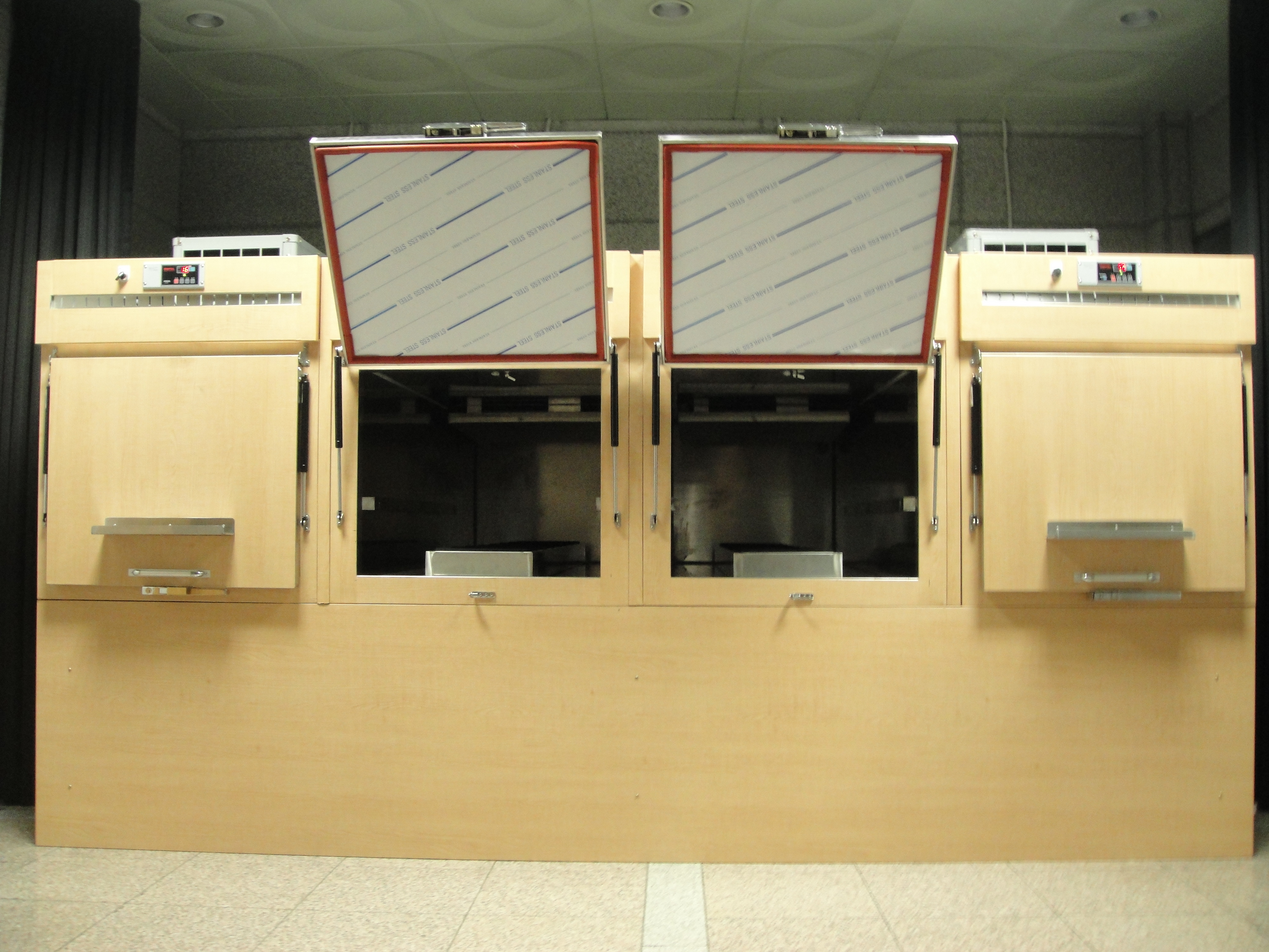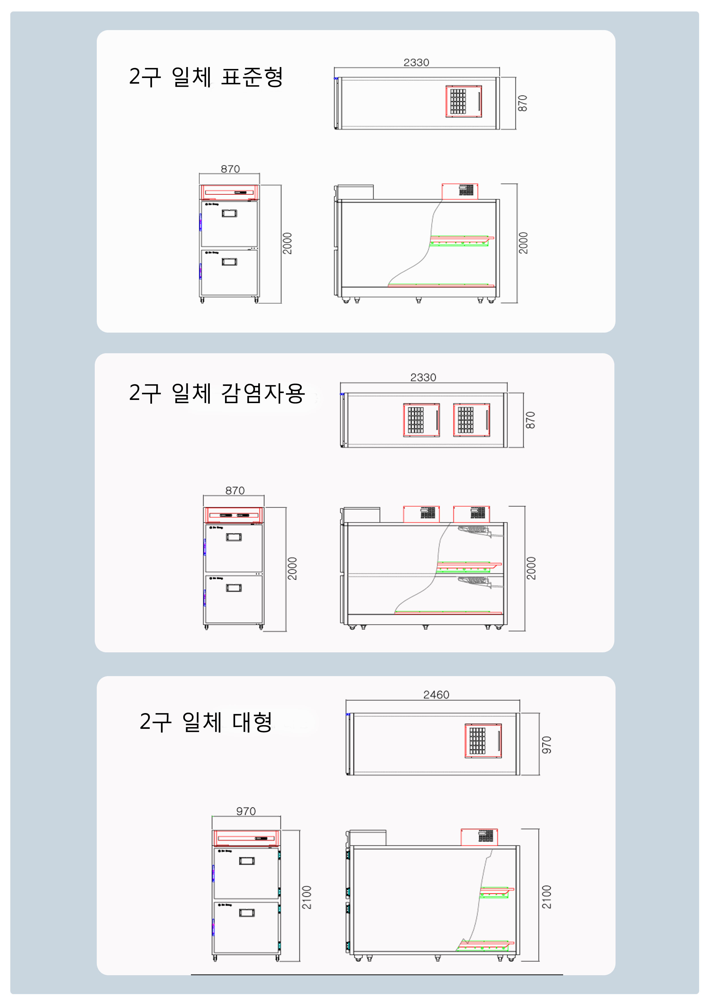 안치냉장고 감염병 2구 1쎄트를 독립적으로 분리하여 각각 콘트롤하고 냉동기계 0.5kw 2대를 부착하여 제작 제조합니다.