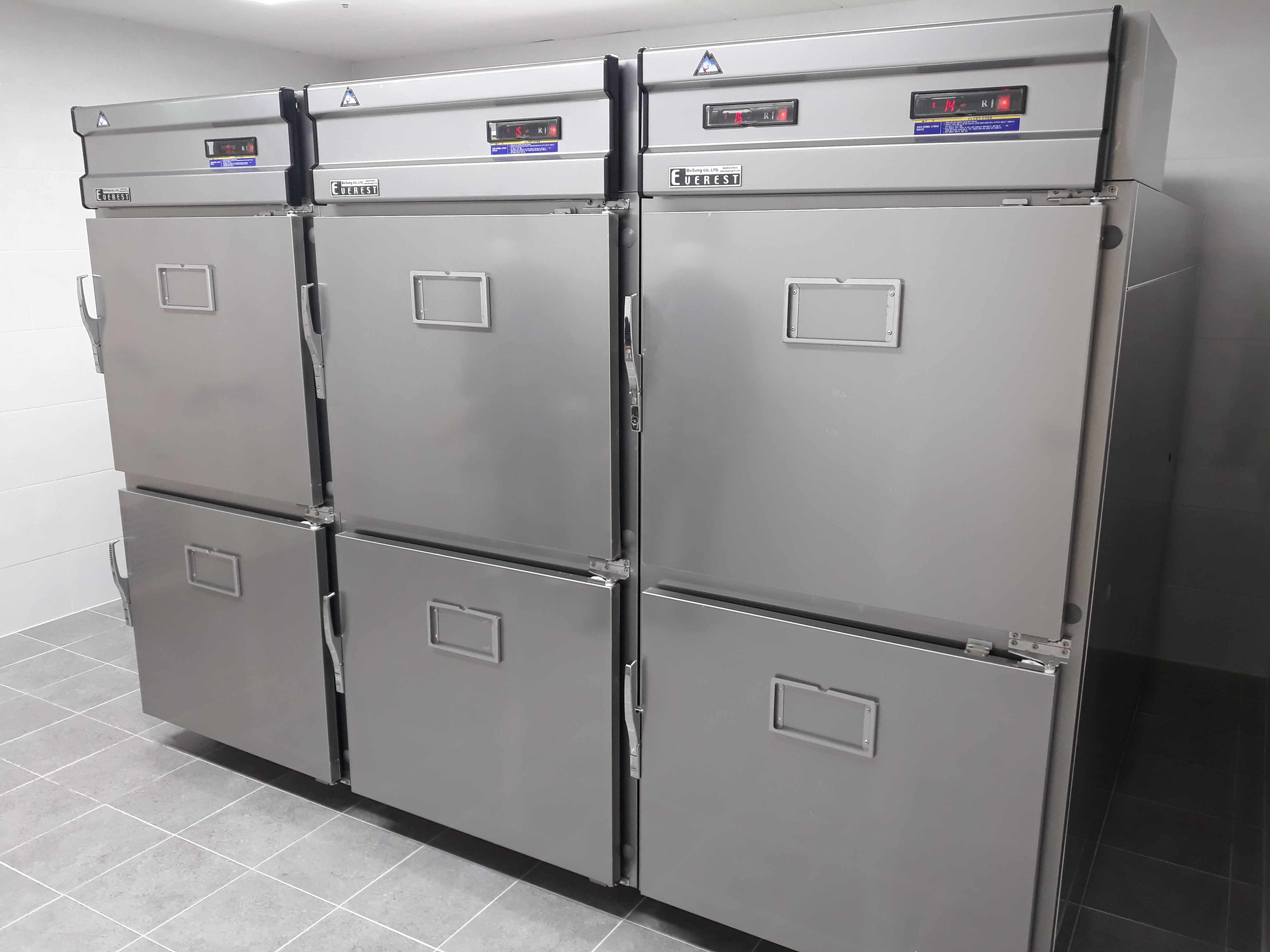 시신안치냉장고 2구 1쎄트를 연결하여 시공 설치 시신안치냉장고 사용온도 +4도입니다. 실외기를 밖에 설치 하였습니다. 2구 1쎄트 크기 880x2400x1950 중량 400kg