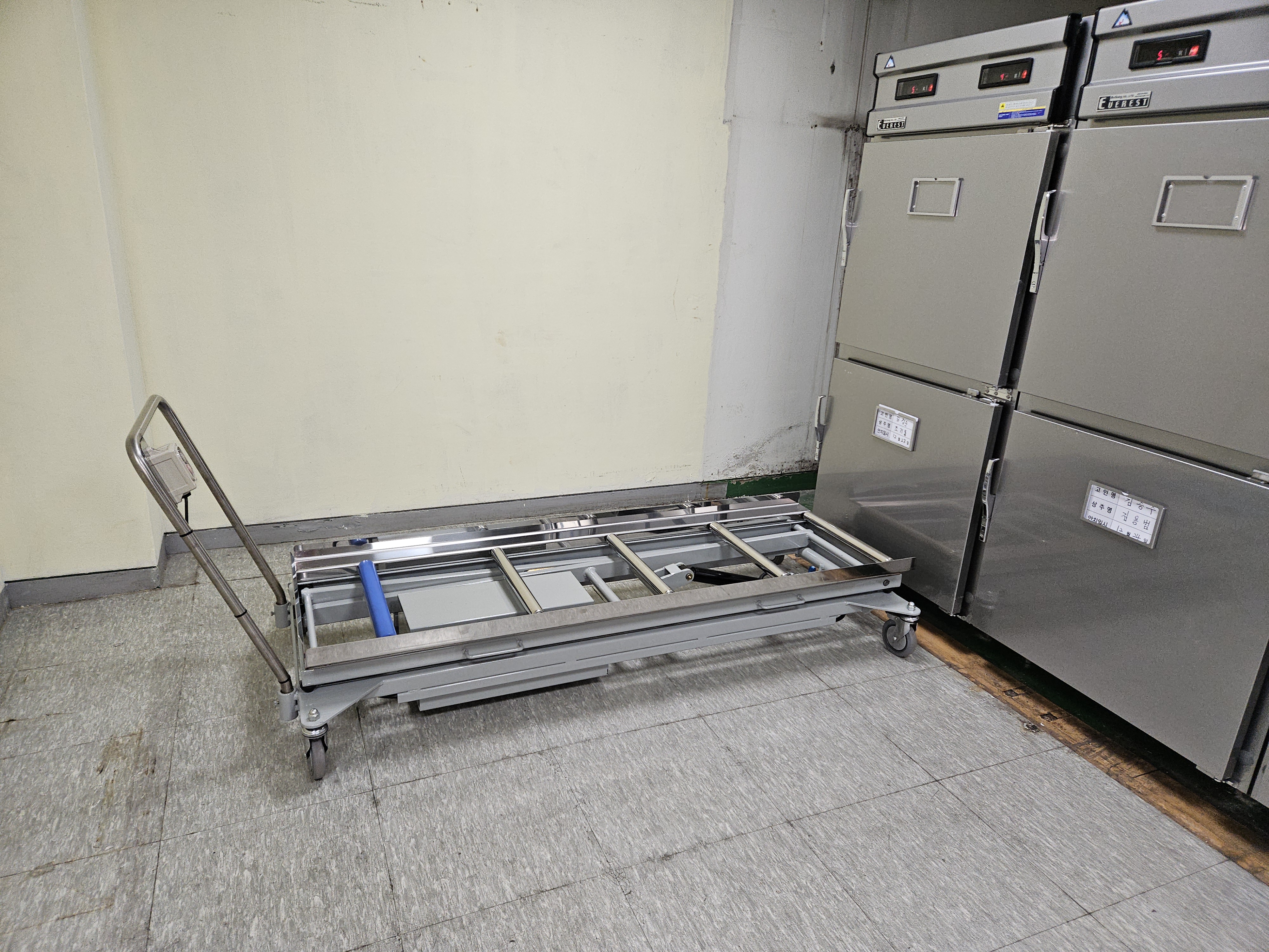 영안실냉장고 기본 구성 본체, 트레이 2개, 응급콜시스텔, 온도모니터링시스템, 본체,내부,밧드,레일가이드, 냉동기계로 되어있습니다.