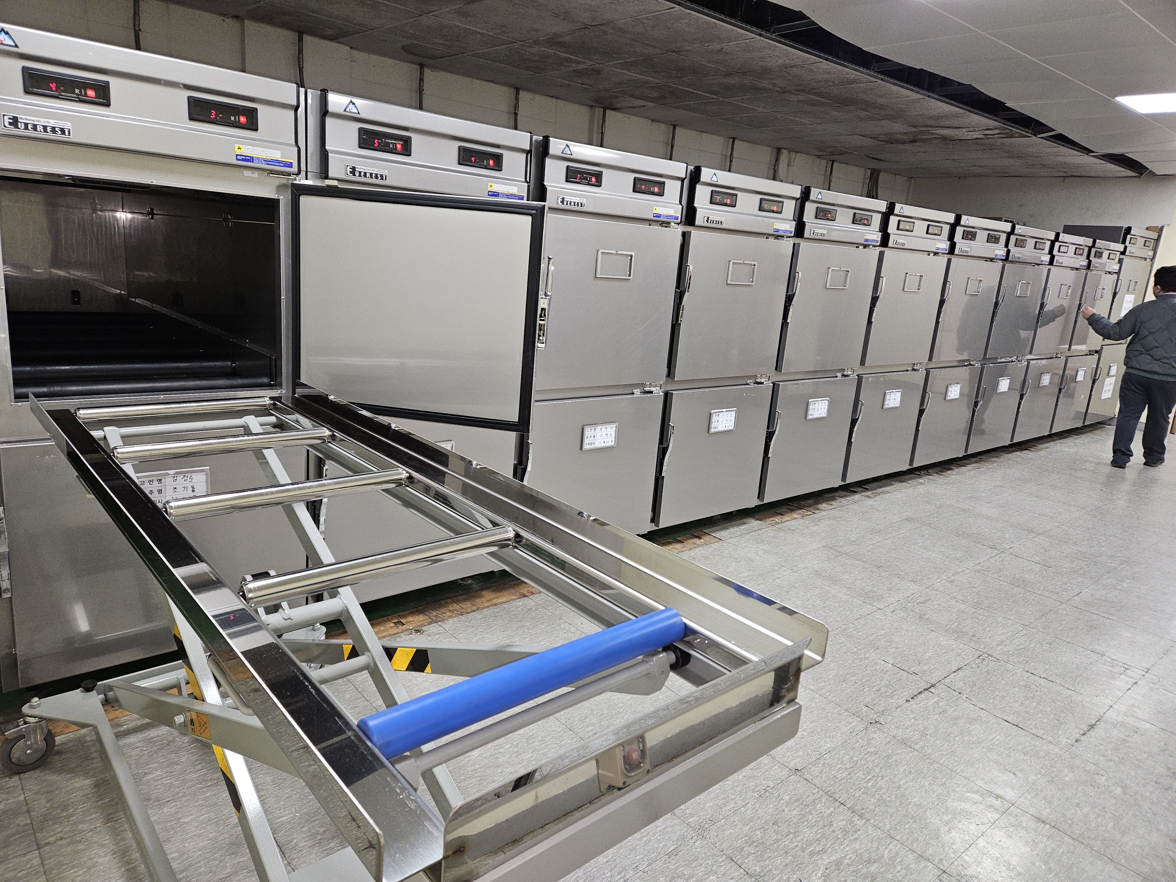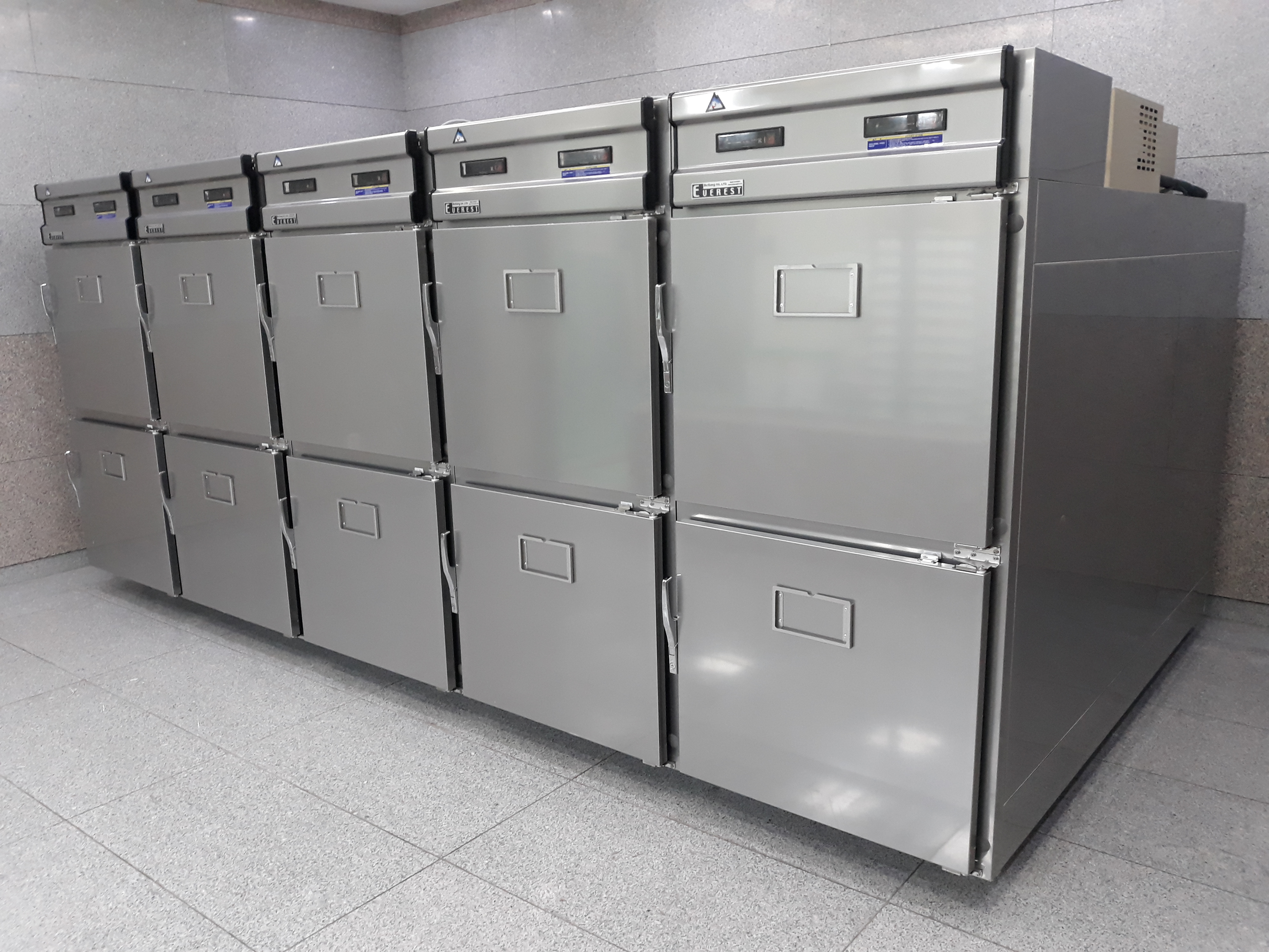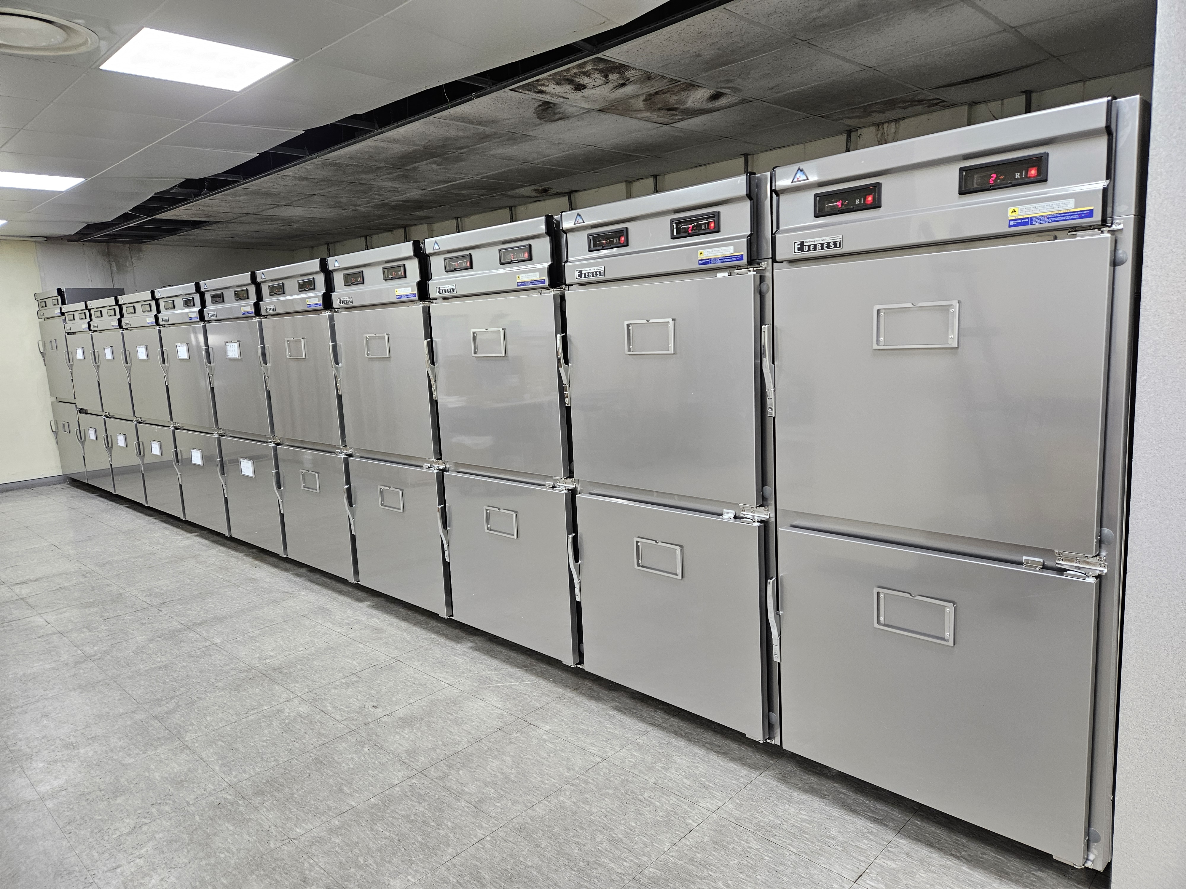 영안실 냉장고 운영 기능 시스템 : 2구용(표준형) Digital control 온도계 및 자동온도 조절기능 자동 제상기능 설정온도 에러 알람기능 결로현상 방지기능 안전장치 기능 과전류 계전기, 과전류 개폐기, 보조 계전기 Door 외부에 이름표 부착용를 장착