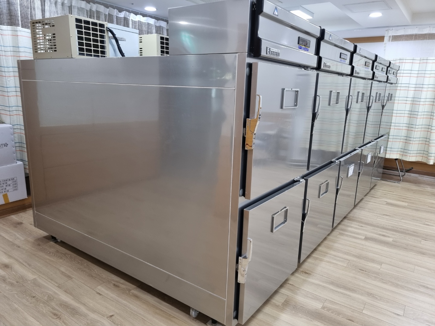 병원영안실냉장고 시신8구보관할 수 있게 설치 감염병용 2구 일반용 6구 감염병용은 아래 위가 분리되여 각각 냉동기계설치하여 콘트롤합니다.