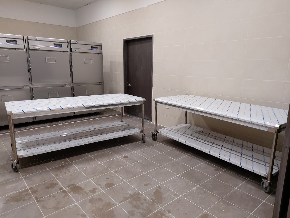 영안실 안에 시신보관냉장고 염다이 운반다이 납품 영안실냉장고 사용 온도 +4도 시신장기보관 시 사용온도 -5도 이하로 사용합니다.