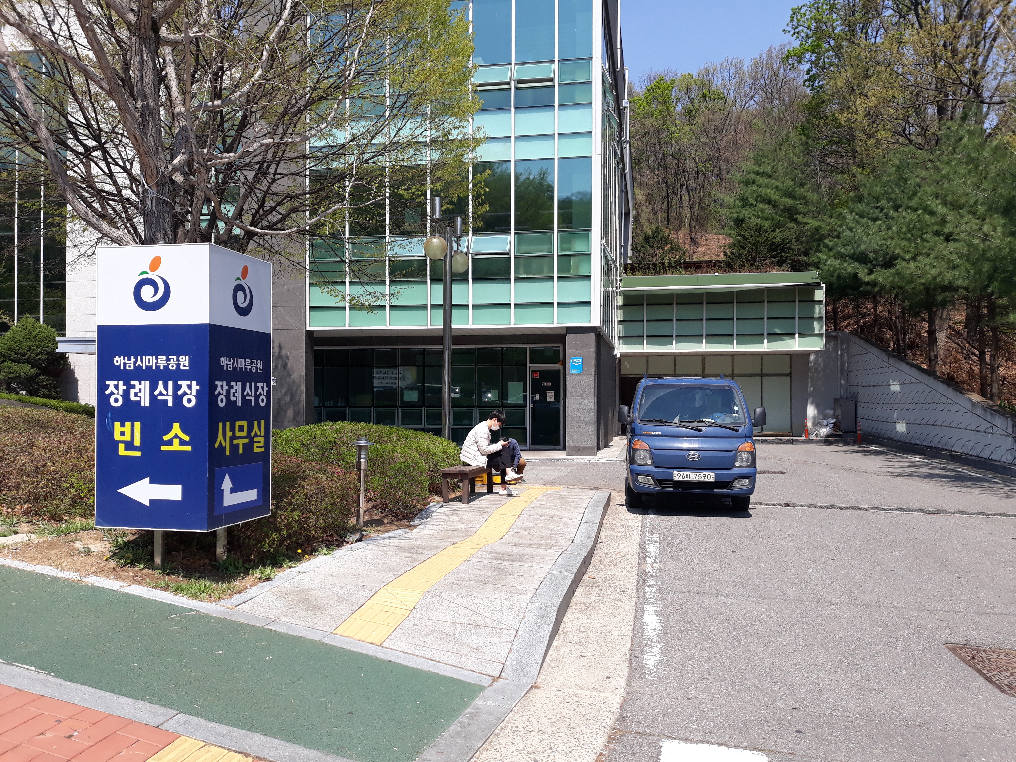 장례식장 영안실 입구에서 영안실 냉장고 기다리고 있습니다.